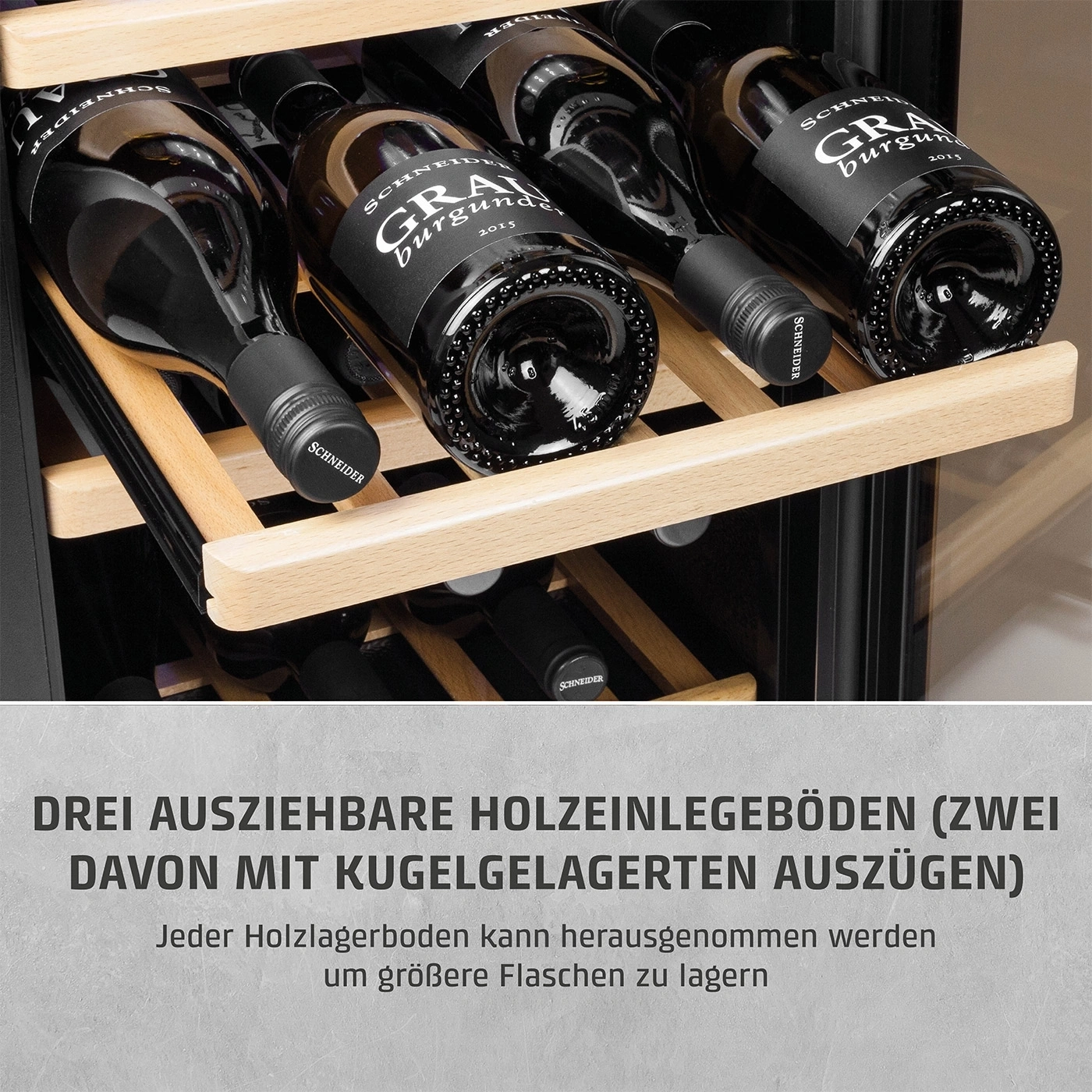 • Tres estantes de madera extraíbles (dos de ellos con guías con rodamientos).